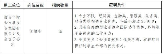 備注:市外首次來煙就業(yè)的35周歲以下(特別優(yōu)秀的年齡可適當(dāng)放寬)非應(yīng)屆畢業(yè)生,如有應(yīng)聘意向,可先通過管培生崗位應(yīng)聘,如符合煙臺市人才引進政策,且順利通過集團招聘考核,將根據(jù)應(yīng)聘人員工作履歷情況,結(jié)合集團實際用工需求,主要分配到投資管理、融資租賃、保理、綜合文秘、運營管理等工作崗位。